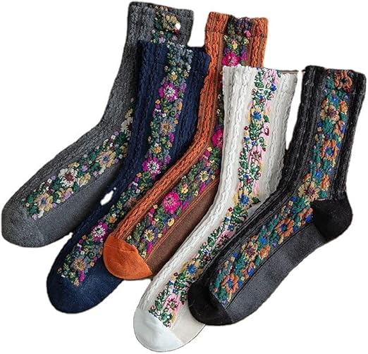 Women's Floral Design Vintage Crew Socks Ethnic Jacquard Knit Set, Blue, Gray, Pink, Yellow,Purple, 7 (WS5B)